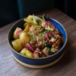Poitrine de cochon confite au miel, jus au cidre, pommes de terre grenailles, fenouil rôti et oignon confit.