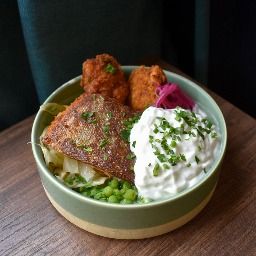 Haut de cuisse de poulet panée, sauce teriyaki, riz japonica, salade de chou blanc vinaigrée et edamamé.