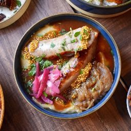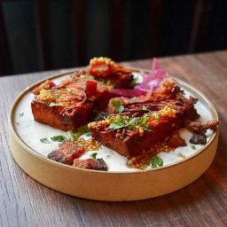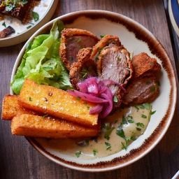 Röstis de pomme de terre, cochon croustillant et crème fraîche aux herbes.