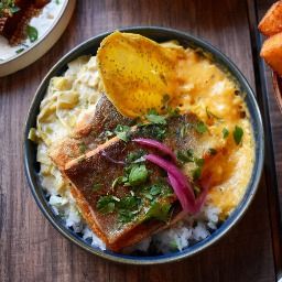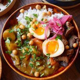 Golden curry, œuf tamago, riz japonica, shiitakés rôtis et pois chiches croustillants