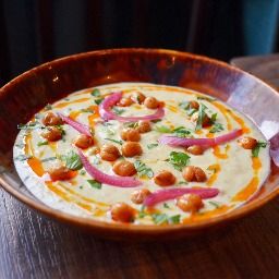Un velouté réconfortant aux légumes, servi avec pois chiches croustillants et huile pimentée